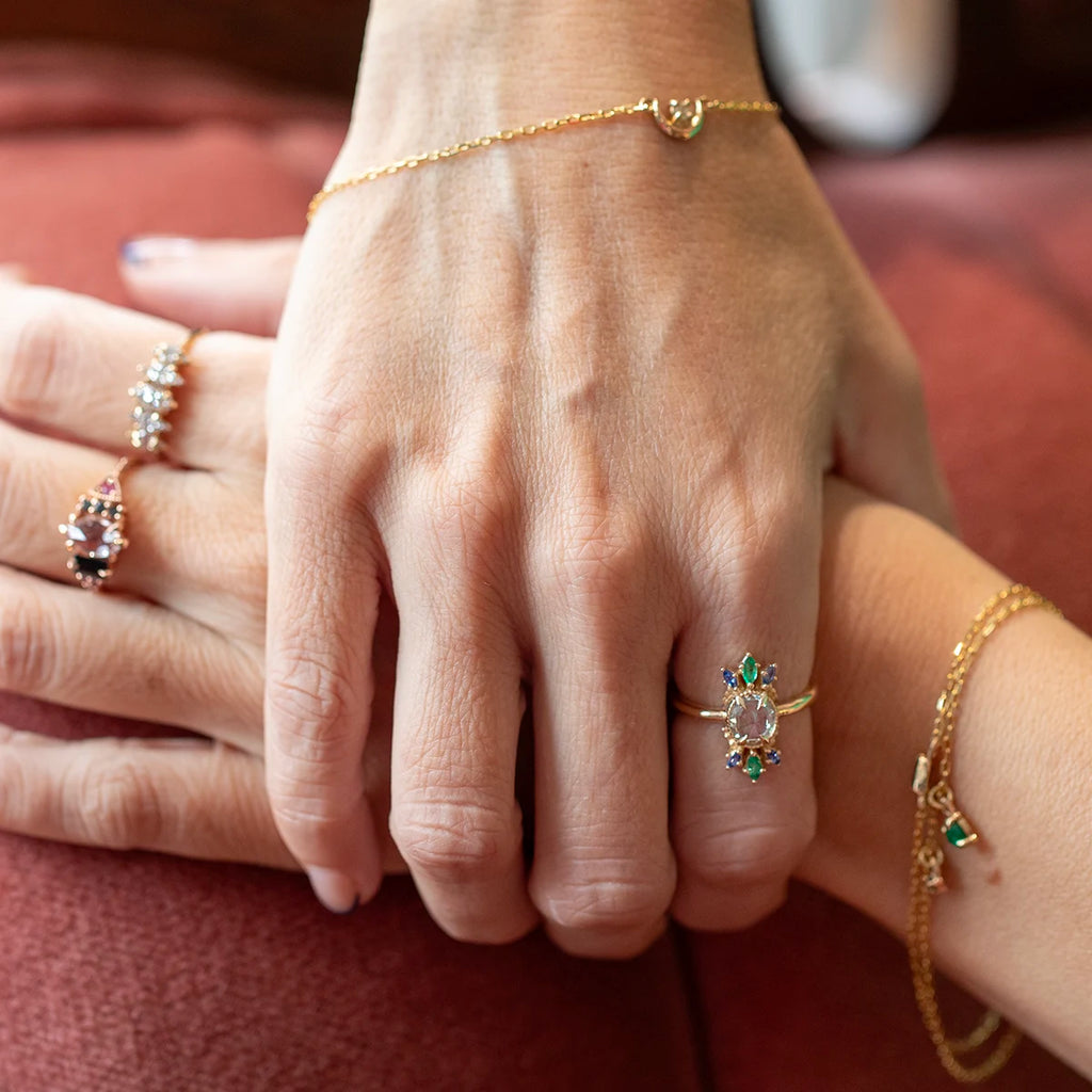 At its center, a luminous rose cut sapphire from Sri Lanka — clear as light — framed by flashes of marquise emerald and deep blue sapphire. A composition that feels alive, joyful, and just a little rebellious.