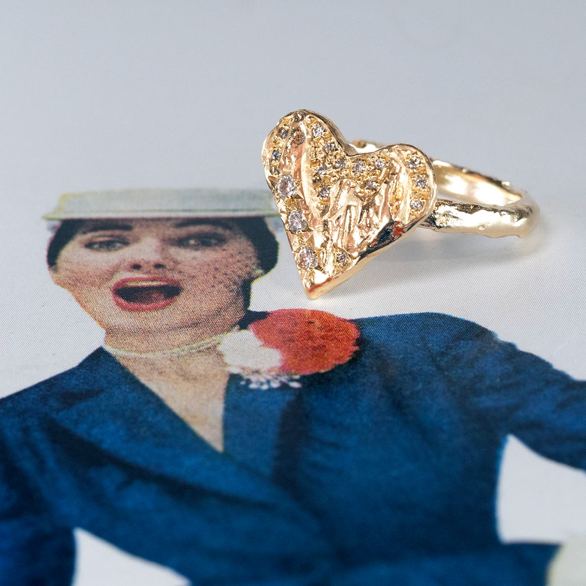 A bold heart in solid 14k gold, sculpted with an organic, almost melted texture and sprinkled with diamonds because why not! It’s playful, over the top, and not here to blend in.