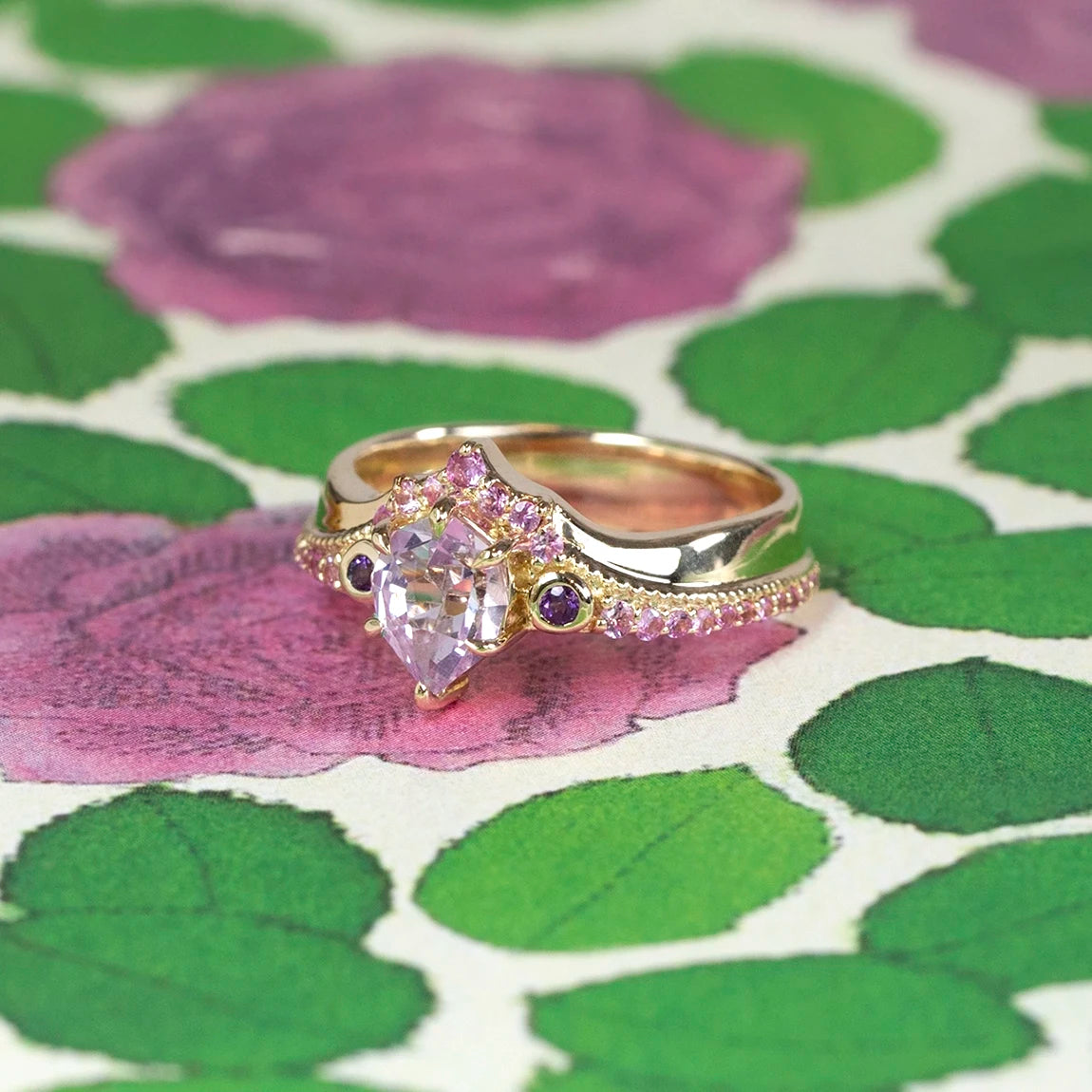 Two bezel-set amethysts frame the centre stone, creating a balanced, almost architectural composition. A wide gold band set with light pink round sapphires adds texture and rhythm, wrapping the finger in subtle colour without overwhelming the design.