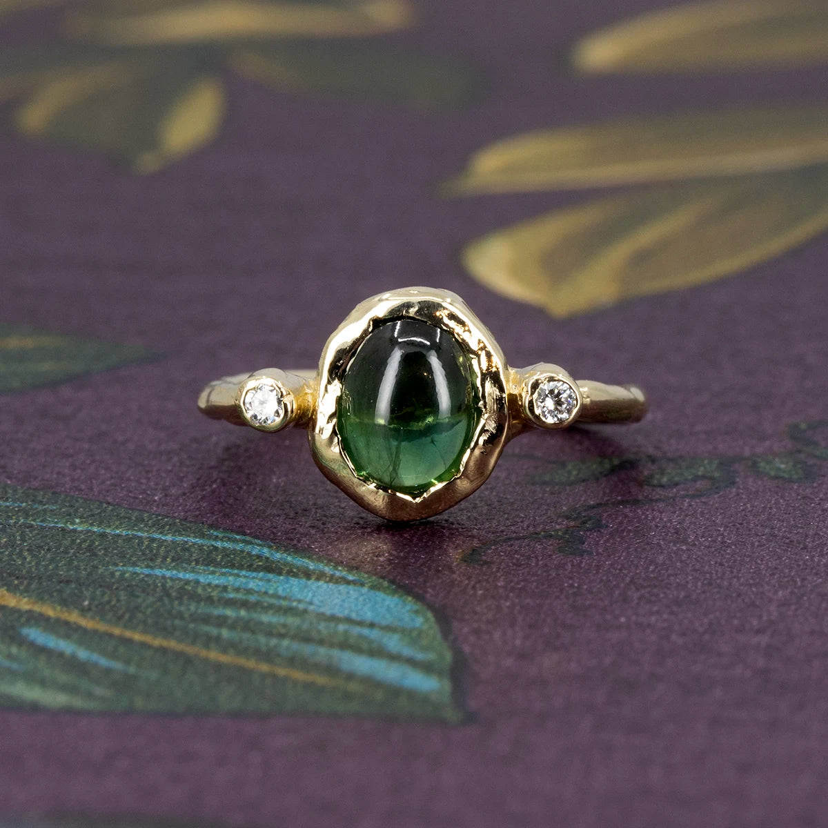 Two lab-grown diamonds are set on either side of the tourmaline, adding balance and a soft touch of brilliance without overpowering the stone. The contrast between the smooth cabochon, the organic gold surface, and the refined diamond accents creates a ring that feels both raw and considered.