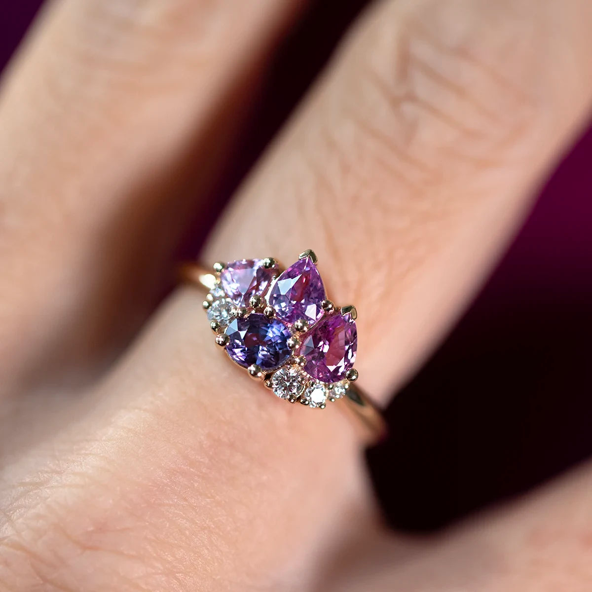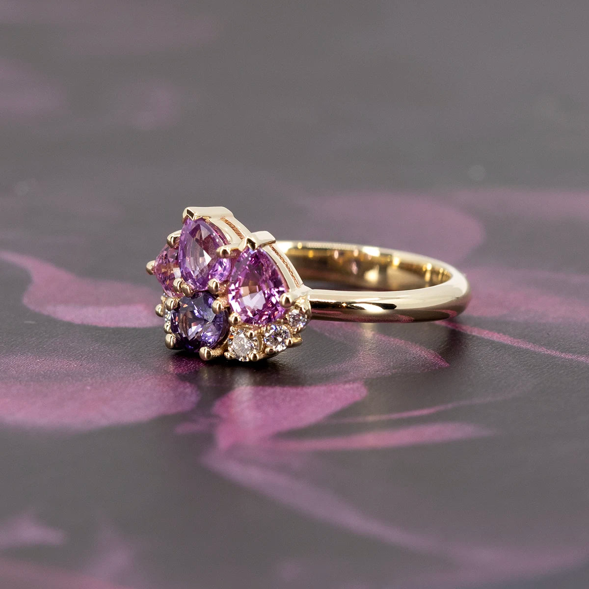 This one-of-a-kind design brings together four natural sapphires in lilac, mauve and pink tones, accented by five bright lab-grown diamonds. Each stone is placed to create an organic, airy composition that feels both playful and artful.