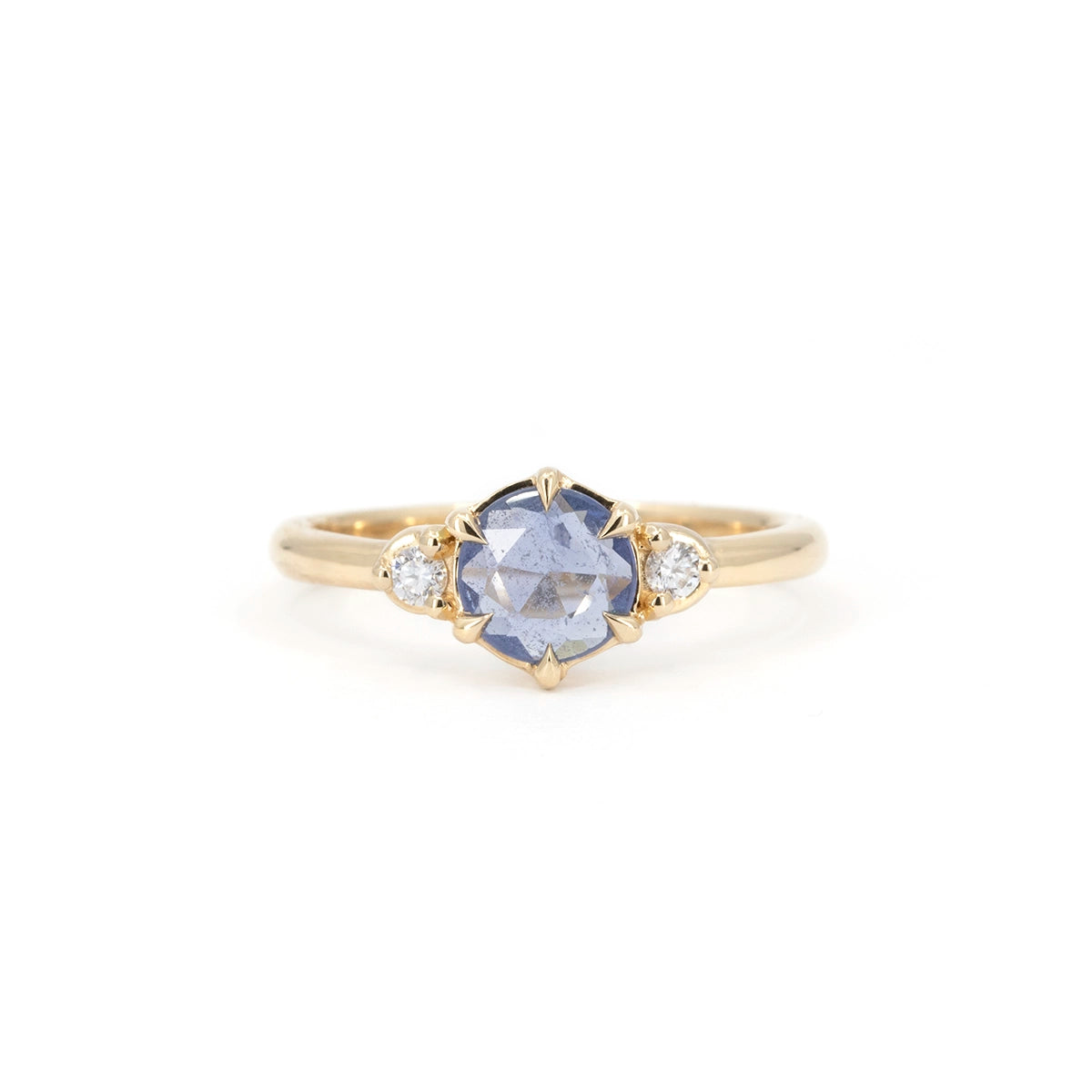 This one-of-a-kind ring features a natural rose-cut blue sapphire held with six delicate prongs, its soft glow framed by two Canadian diamonds. The low profile sits comfortably on the hand while the round band keeps the look balanced and easy to wear.