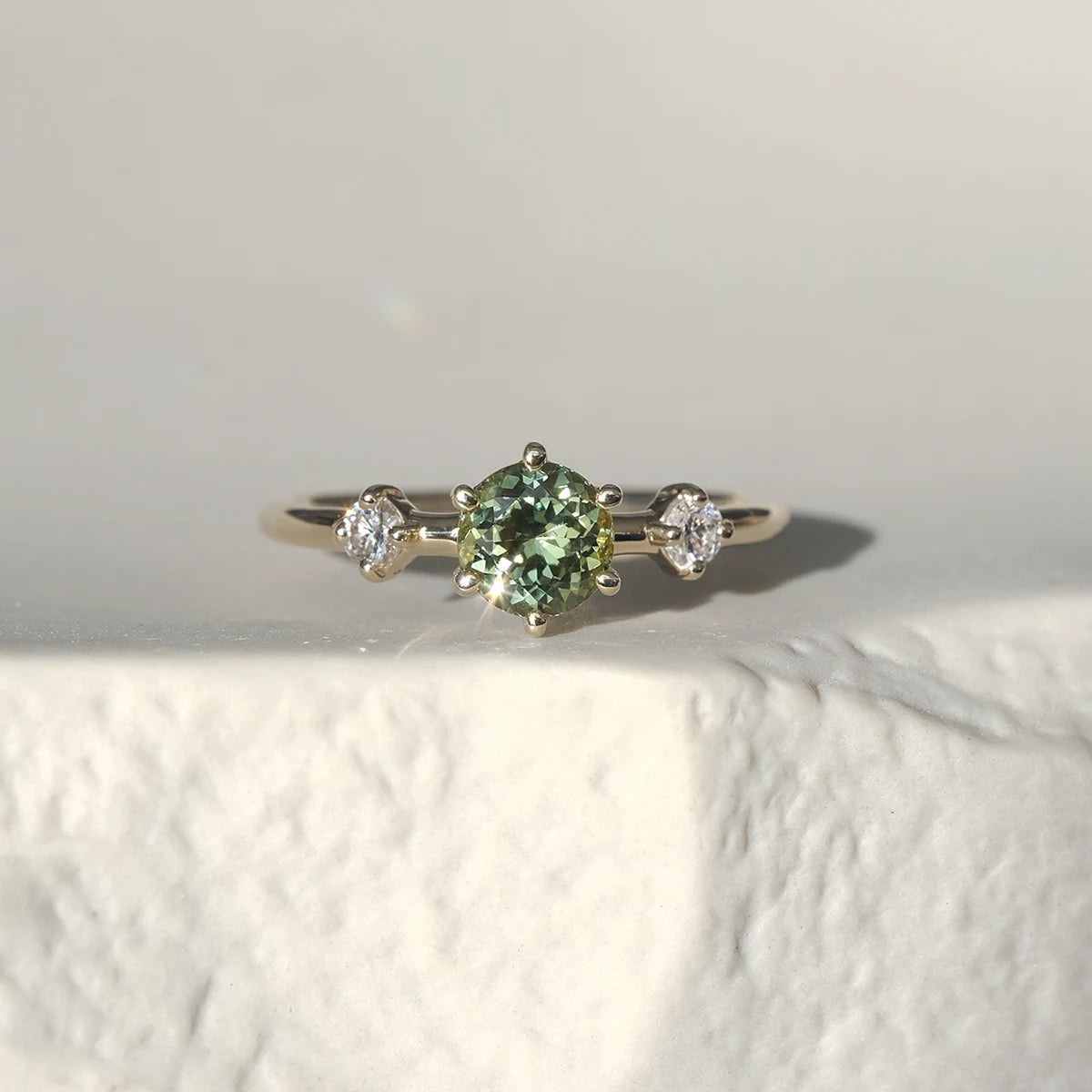 The Isabela ring features a luminous green sapphire at its center, held in a delicate claw setting that allows the stone to catch the light beautifully. Two white diamonds on each side add a subtle sparkle, enhancing the vivid green tones of the sapphire while keeping the design balanced and elegant.