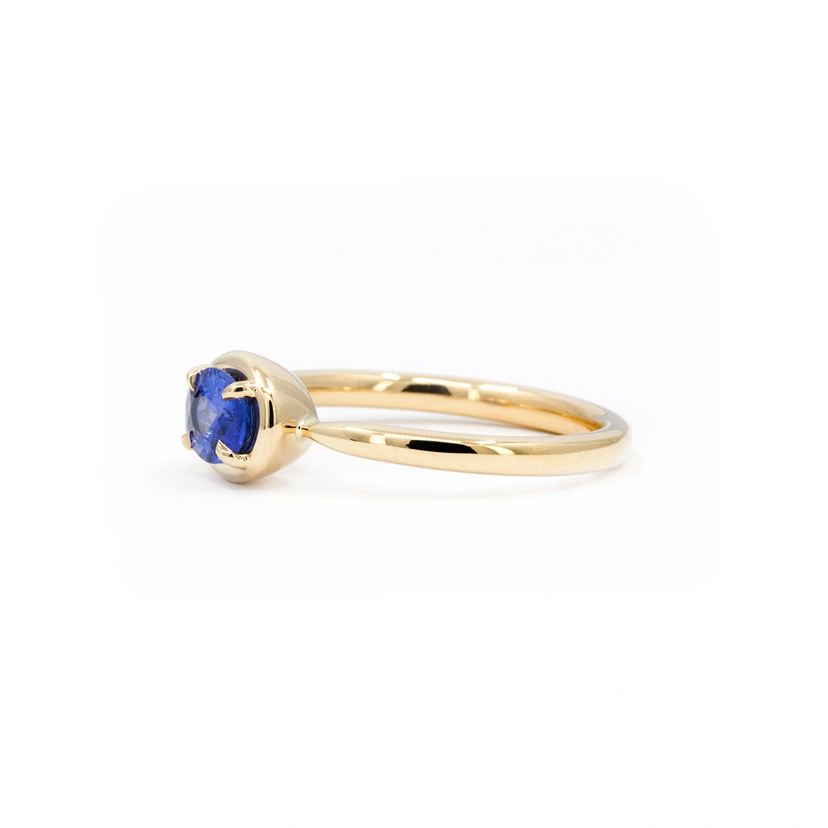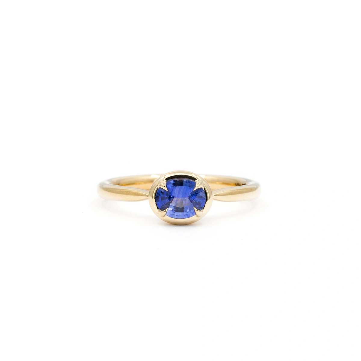 Ce solitaire met en valeur un saphir bleu ovale à la profondeur riche et lumineuse, animé de subtiles variations de teinte qui se révèlent selon la lumière. La pierre est sertie dans un montage distinctif qui marie un serti clos lisse à de délicates griffes en pattes d'aigle, créant un équilibre marqué entre douceur et caractère.